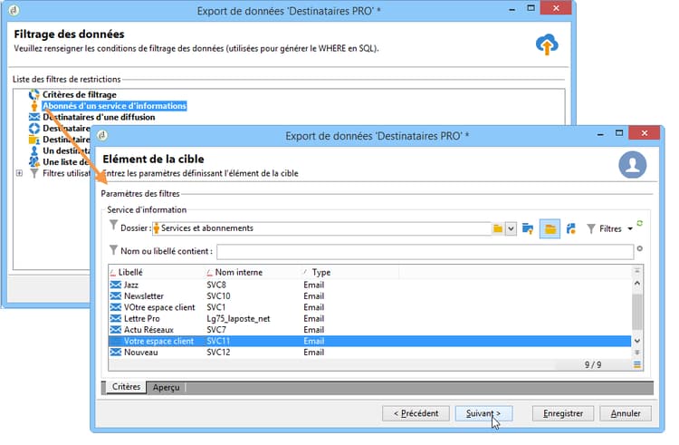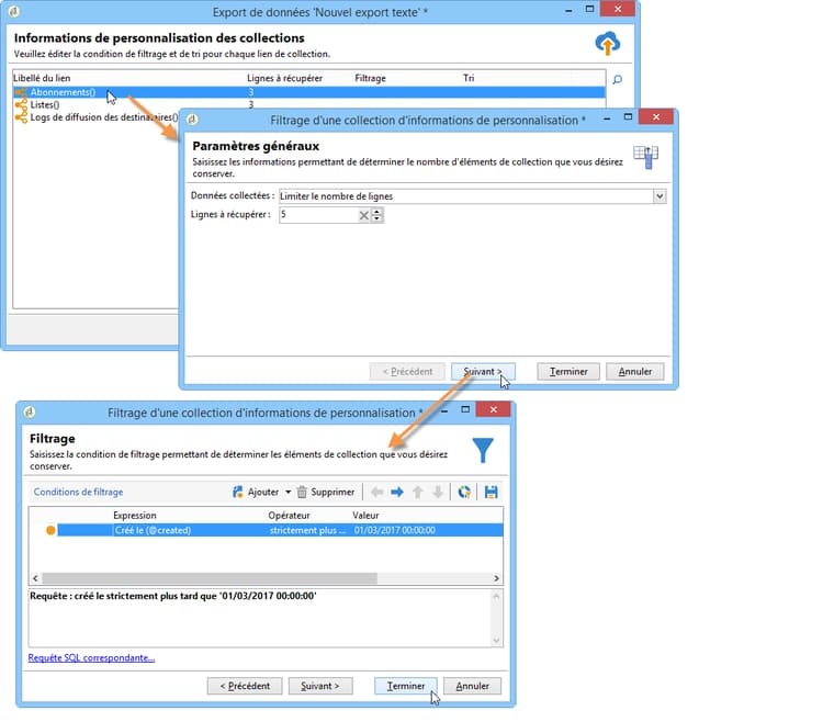 Vous pouvez ajouter des conditions de filtrage afin de ne pas exporter toutes les données. La configuration de ce filtrage correspond à celle du ciblage des destinataires dans l’assistant de diffusion.