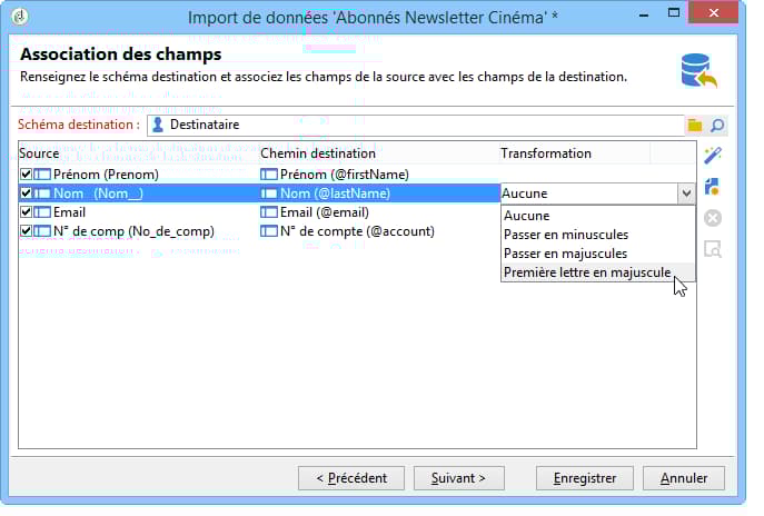 Pour appliquer une transformation de casse au contenu d'un champ, sélectionnez-la depuis la colonne Transformation. Vous pouvez choisir :
