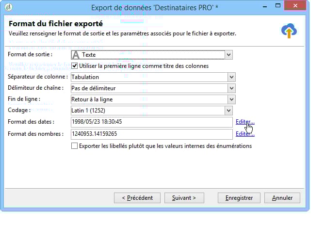 - Indiquez le format de date et le format des nombres. Pour cela, cliquez sur le bouton Editer correspondant au champ et utilisez l'éditeur.