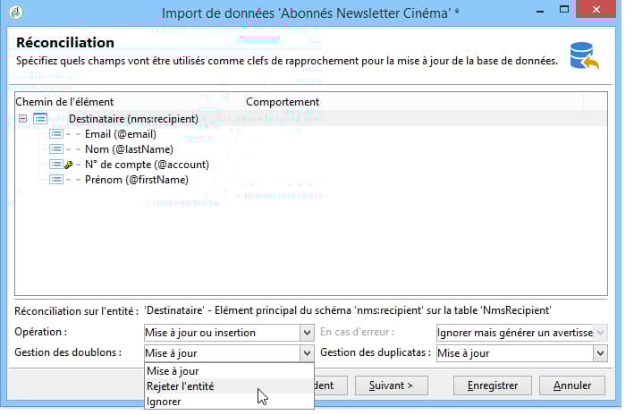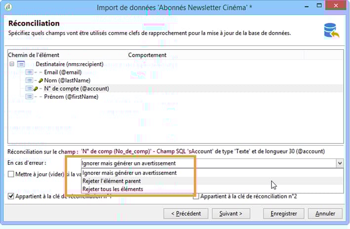 Dans ce cas, pour savoir si une ligne du fichier correspond à un destinataire existant dans la base de données, le moteur d'import compare les valeurs du fichier avec celles de la base de données pour tous les champs de la clé. Plus les champs sont spécifiques à un enregistrement, plus la comparaison entre les données source et destination pourra être fine et garantir l'intégrité des données après l'import. Il est possible de renseigner une seconde clé de réconciliation pour une même table : elle sera utilisée pour les lignes dont la première clé est vide.