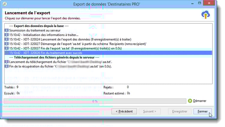 Cliquez sur Démarrer pour lancer l’export des données.