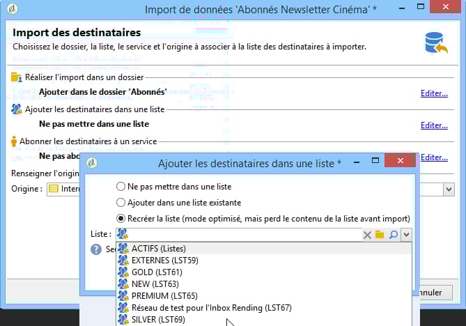 Le lien Editer… de la section Ajouter les destinataires dans une liste permet de sélectionner ou créer une liste dans laquelle seront ajoutés les destinataires importés.