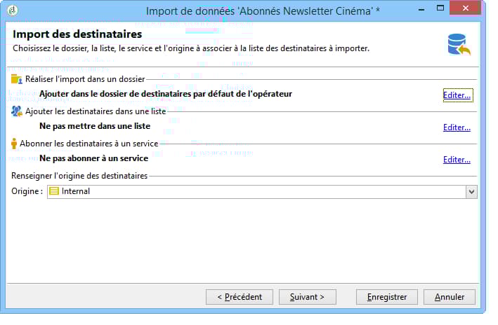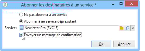Pour abonner tous les destinataires importés à un service d'information, cliquez sur le lien Editer… Vous pouvez sélectionner l'option Envoyer un message de confirmation : le contenu de ce message est défini dans le modèle de diffusion associé au service d'abonnement.