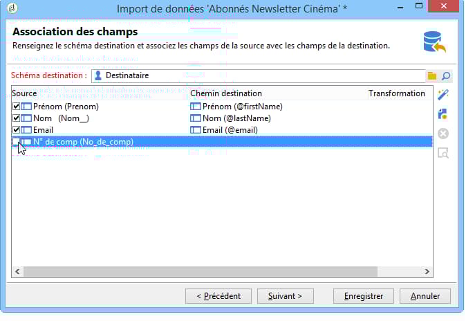 note important IMPORTANT La transformation est appliquée au moment de l'importation. Toutefois, si des contraintes ont été définies sur les champs de destination (dans l'exemple ci-dessus, sur le champ @lastname), ces dernières sont prioritaires. -