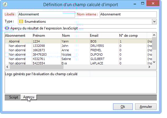 L'onglet Aperçu permet de visualiser le résultat du paramétrage défini. Ici, la colonne Abonnement a été ajoutée. La valeur est calculée à partir du champ Statut.