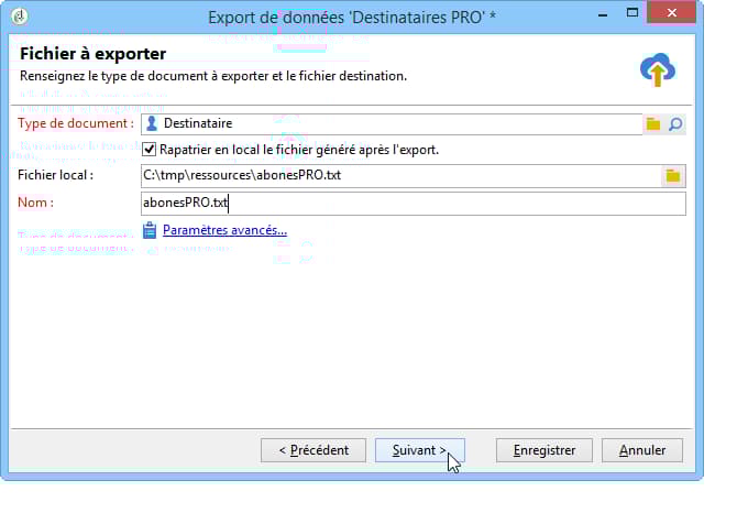 Il peut, par exemple, être utile d’exploiter dans un tableur les données de suivi d’une campagne (historique de tracking, etc.). Les données de sortie peuvent être au format txt, CSV, TAB ou XML.