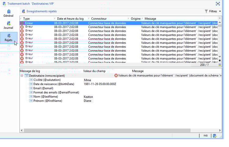 - Les rejets du connecteur base de données concernent les erreurs ayant lieu lors de la réconciliation des données ou de l'écriture dans la base. Dans le cas d'un import sur plusieurs tables, le rejet peut ne concerner qu'une portion de l'enregistrement (par exemple pour un import de destinataires et d'événements associés, une erreur peut empêcher la mise à jour d'un événement sans pour autant rejeter le destinataire).