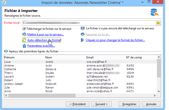 Une fois le fichier spécifié, vous pouvez en visualiser les données dans la section inférieure de la fenêtre en cliquant sur le lien Auto-détection du format. Cet aperçu affiche les 200 premières lignes du fichier source.