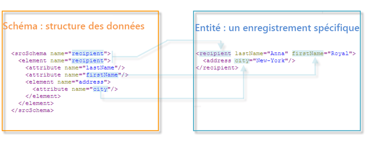 Les balises <element> définissent les noms des éléments d'entité. Les balises <attribute> du schéma définissent les noms des attributs dans les balises <element> auxquelles elles ont été liées.