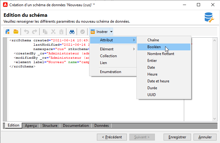 Les attributs vous permettent de définir les champs qui constituent votre objet de données. Vous pouvez utiliser le bouton Insérer dans la barre d’outils d’édition du schéma pour déposer les modèles d’attribut vides dans le XML où se trouve votre curseur. En savoir plus dans cette section.