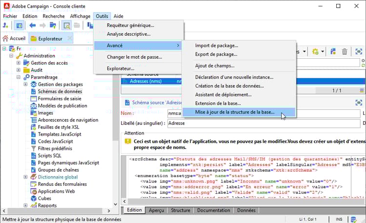 La structure physique et logique des données véhiculées dans l'application est décrite en XML et respecte une grammaire propre à Adobe Campaign appelée schéma.