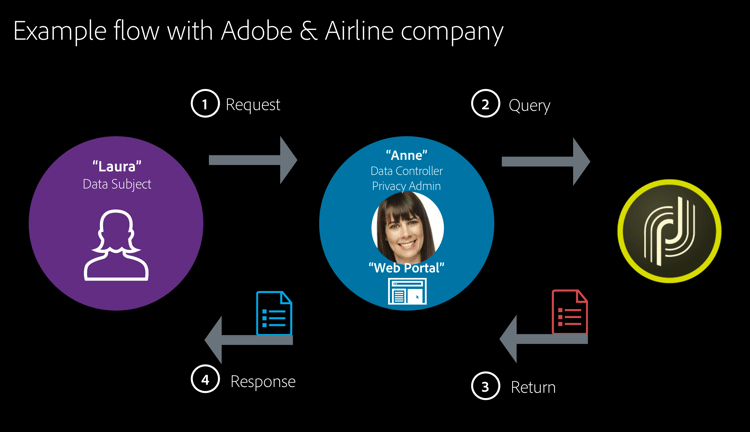 • Anne est le contrôleur de données de la compagnie aérienne. Elle reçoit la demande de Laura, récupère les identifiants utiles requis pour identifier la personne titulaire de données et soumet la demande dans Adobe Campaign.
