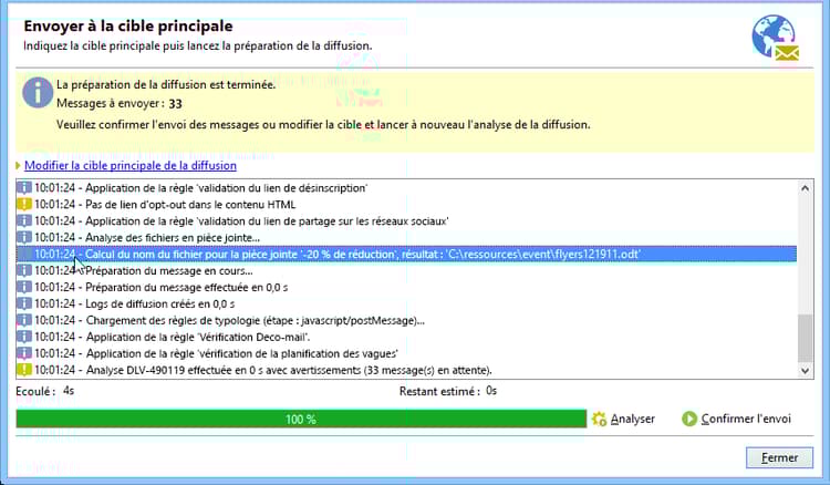 Vous pouvez calculer le nom d’une pièce jointe pendant la préparation de la diffusion. Pour cela, sélectionnez l’option Le nom de fichier est calculé lors de l’analyse de la diffusion (il ne peut pas dépendre du destinataire).