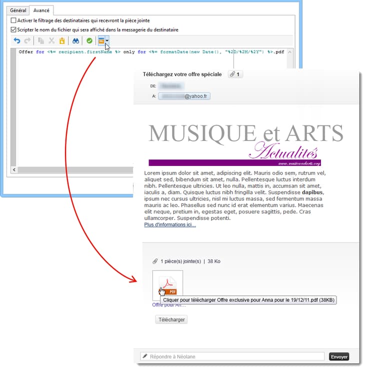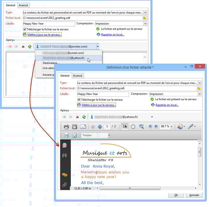 Lorsque vous créez un attachement calculé, le nom de la pièce jointe peut être calculé au moment de l'analyse ou de l'envoi pour chaque message et dépendre du destinataire. Il peut également être personnalisé et converti en PDF.