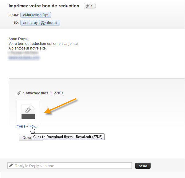 Dans l'exemple ci-dessous, le fichier attaché a été choisi en fonction de son nom tel qu'il a été défini à l'aide des champs de fusion.