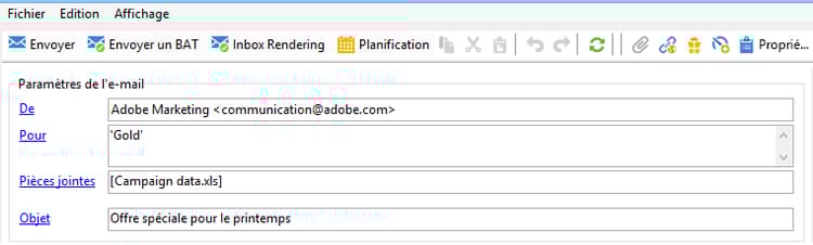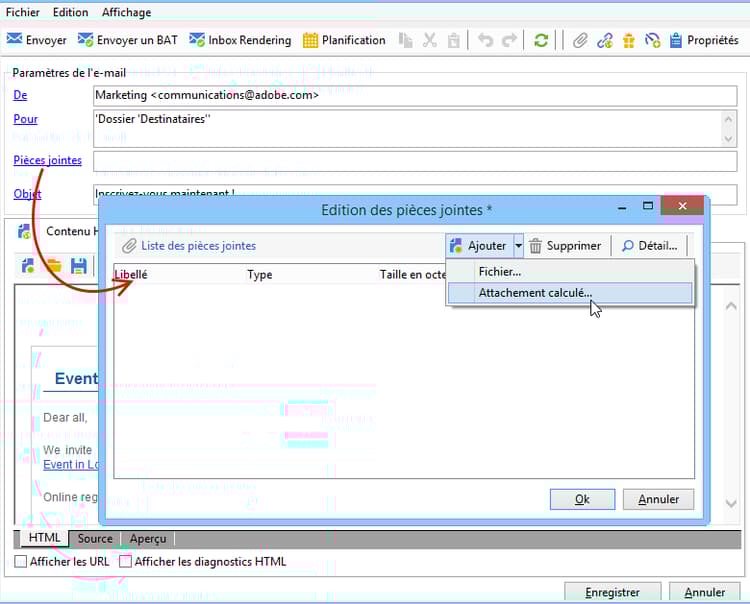 - Personnaliser le contenu de la pièce jointe pour chaque destinataire. Dans ce cas, vous devez créer un attachement calculé : le nom de la pièce jointe est calculé au moment de l'envoi pour chaque message et peut ainsi dépendre du destinataire. Le contenu peut également être personnalisé et converti en PDF au moment de l'envoi, si vous avez souscrit à l'option Variable Digital Printing.