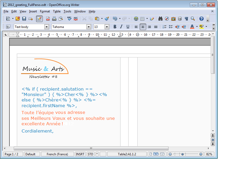 L’option Le contenu du fichier est personnalisé et converti en PDF au moment de l’envoi pour chaque message permet de sélectionner un fichier avec des champs de personnalisation tels que le nom et le prénom du destinataire visé.