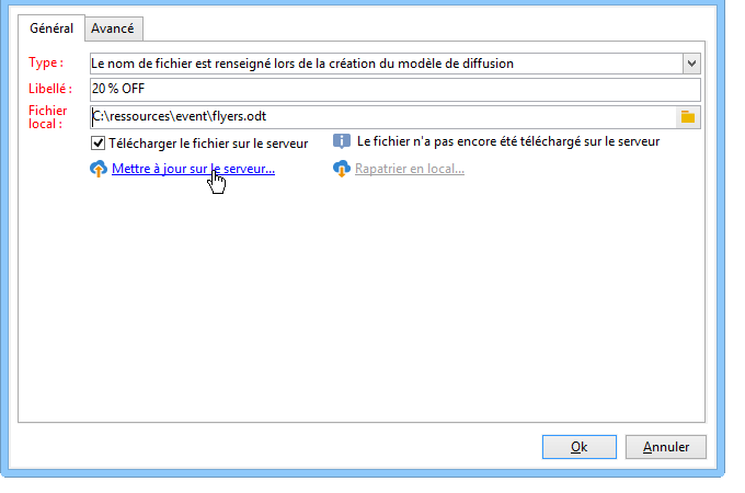 Pour les deux premières options, vous pouvez choisir de Télécharger le fichier sur le serveur, en cochant l'option correspondante. Le lien Mettre à jour sur le serveur permet de lancer le téléchargement.