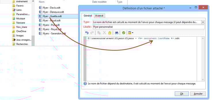Lorsque vous sélectionnez la pièce jointe, vous pouvez choisir l’option Le nom de fichier est calculé au moment de l’envoi pour chaque destinataire (il peut dépendre du destinataire). Vous pouvez ensuite associer les données de personnalisation des destinataires au nom du fichier à envoyer.