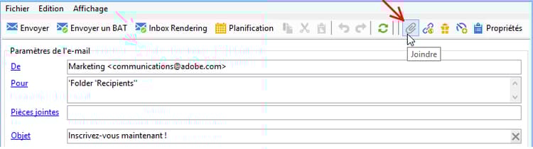 Vous pouvez également faire glisser et déposer directement le fichier dans le champ de diffusion Pièces jointes ou utiliser l’icône Joindre de la barre d’outils de l’assistant de diffusion.