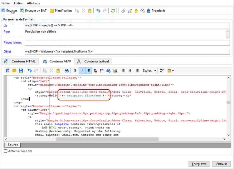 Retournez dans Adobe Campaign et copiez-collez votre contenu validé dans l’onglet Contenu AMP.