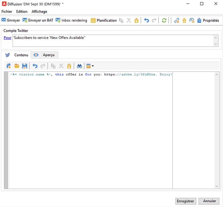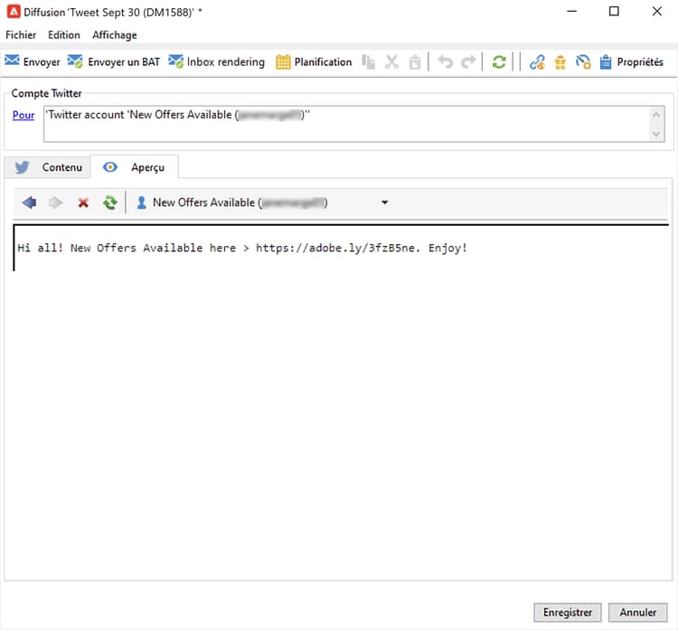Avant d’envoyer votre message, veillez à le valider en envoyant un BAT vers un compte test : vous pouvez ensuite obtenir un rendu exact du message sur un compte X privé et vérifier le contenu et la personnalisation.