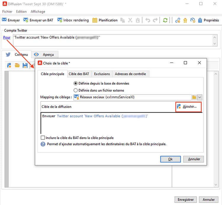 L’onglet Cible des BAT vous permet de définir le compte X à utiliser pour les diffusions test avant la diffusion finale.