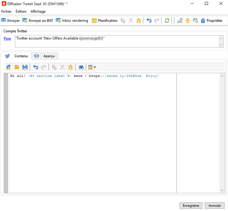 note note NOTE Si vous souhaitez envoyer tous les BAT de vos messages directs au même compte X, vous pouvez enregistrer la cible du BAT dans le modèle de diffusion Poster (message direct), accessible via le nœud Ressources > Modèles > Modèles de diffusion. -
