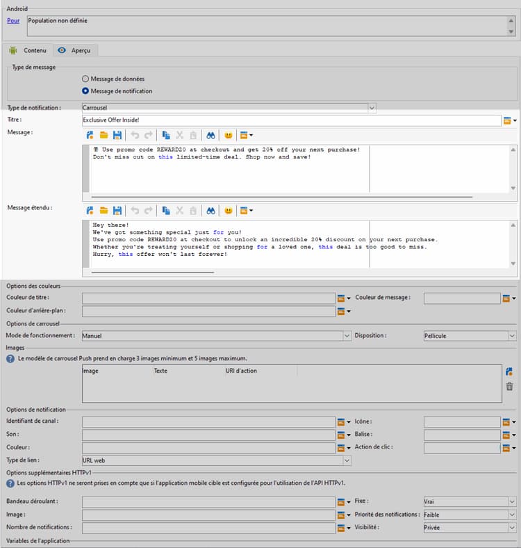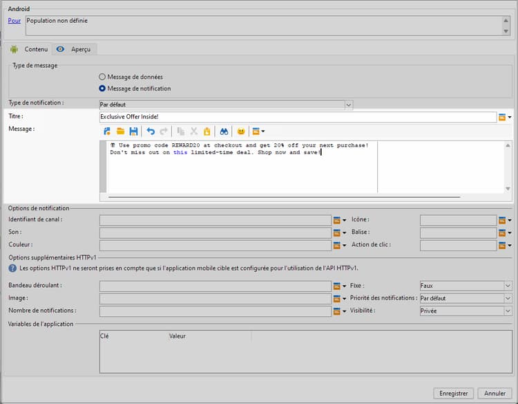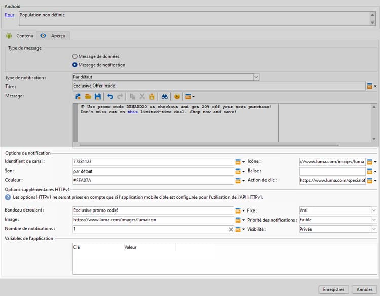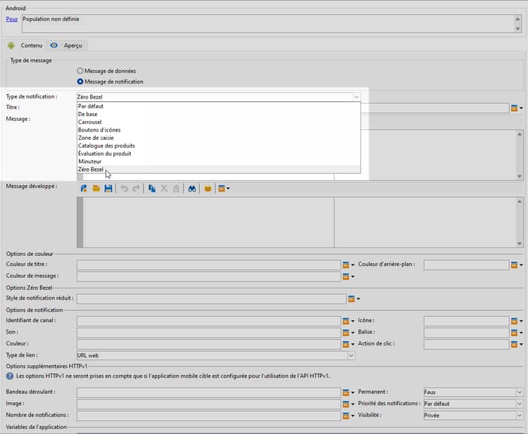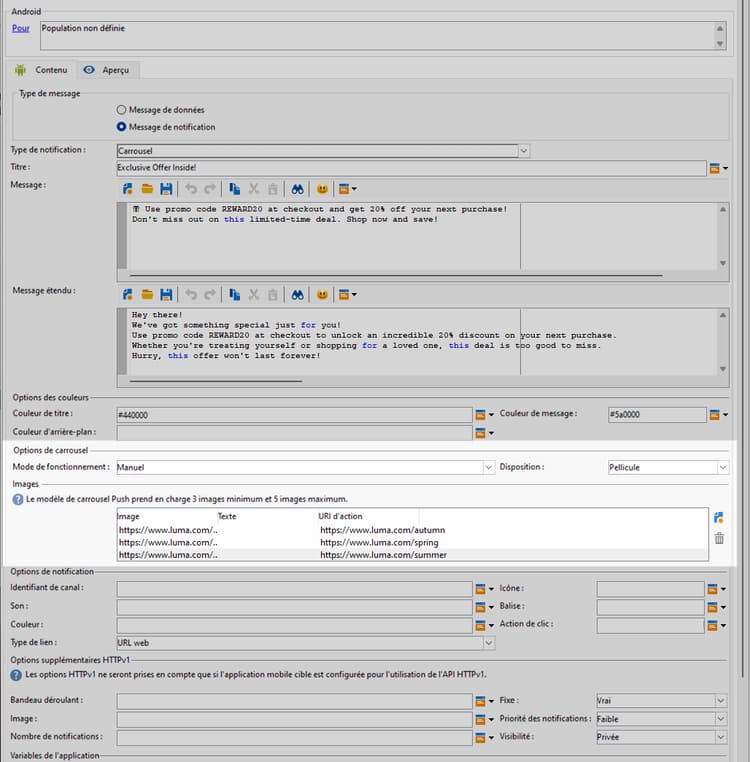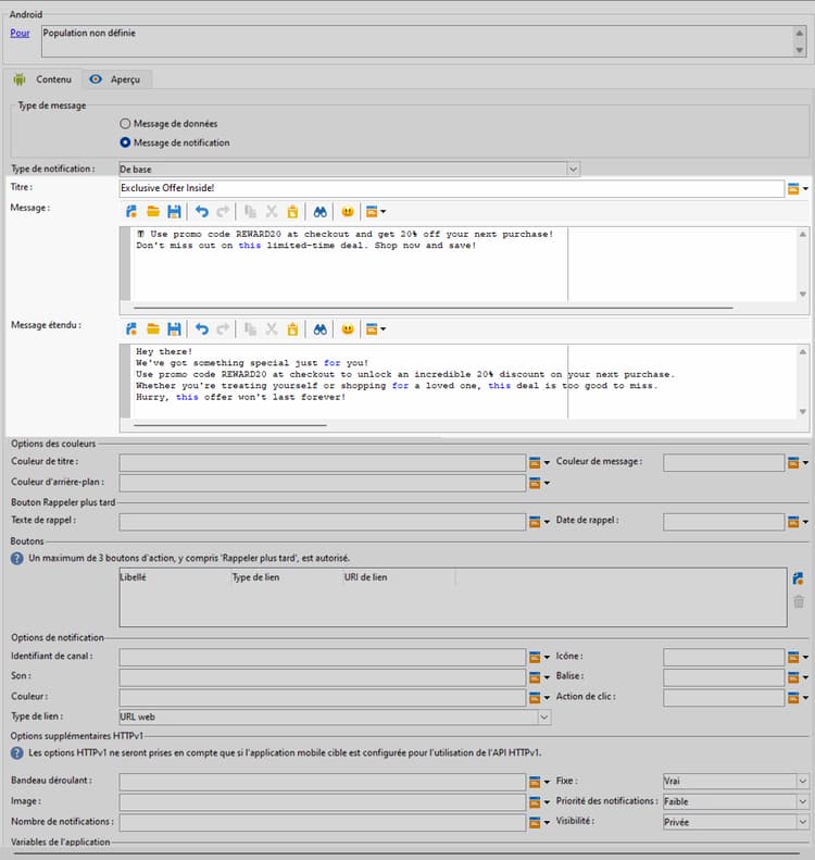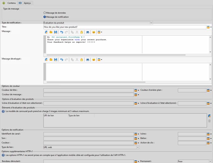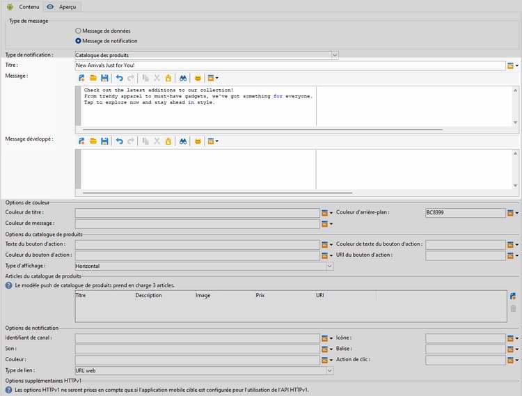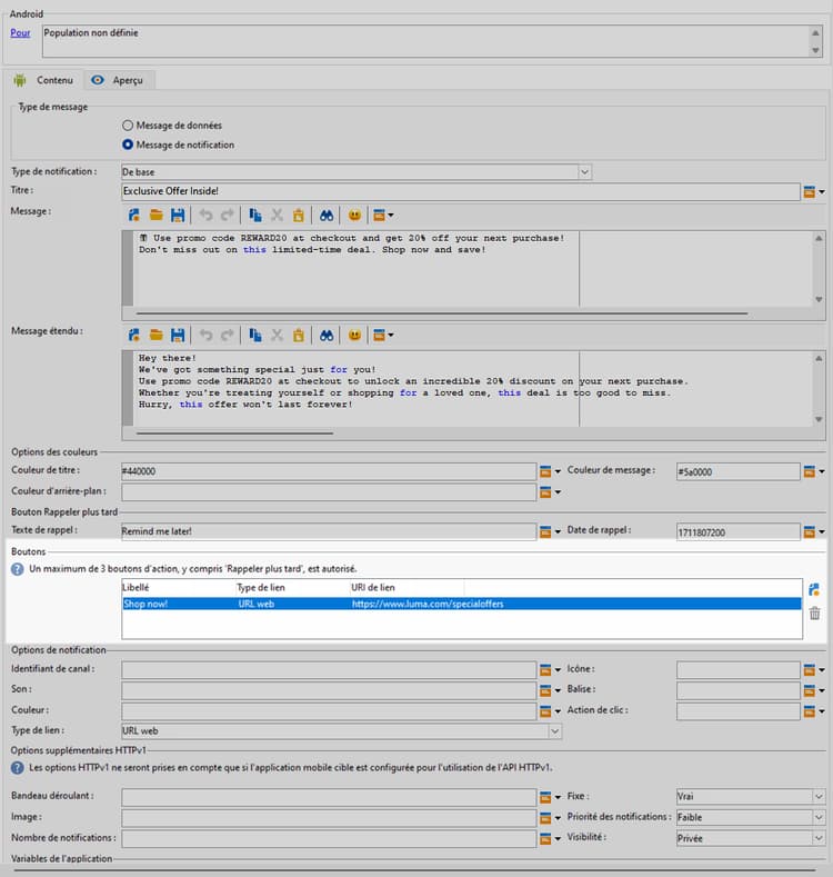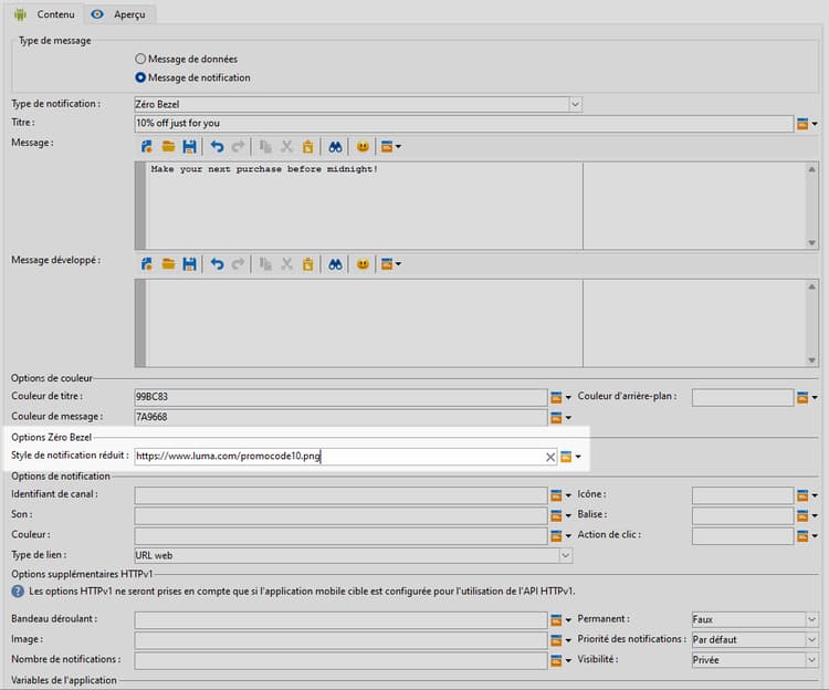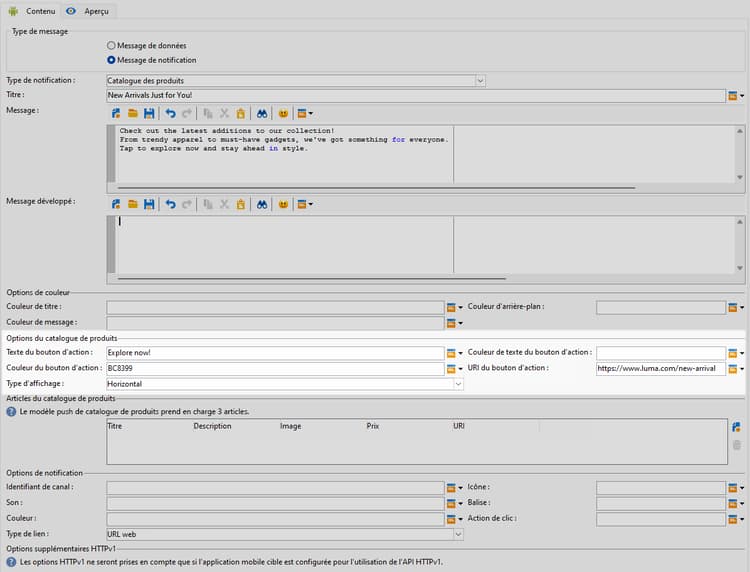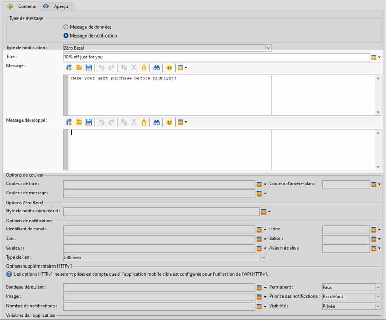 Pour personnaliser davantage votre notification push, configurez les Options de notification et les Options supplémentaires HTTPv1 de votre notification push. En savoir plus
