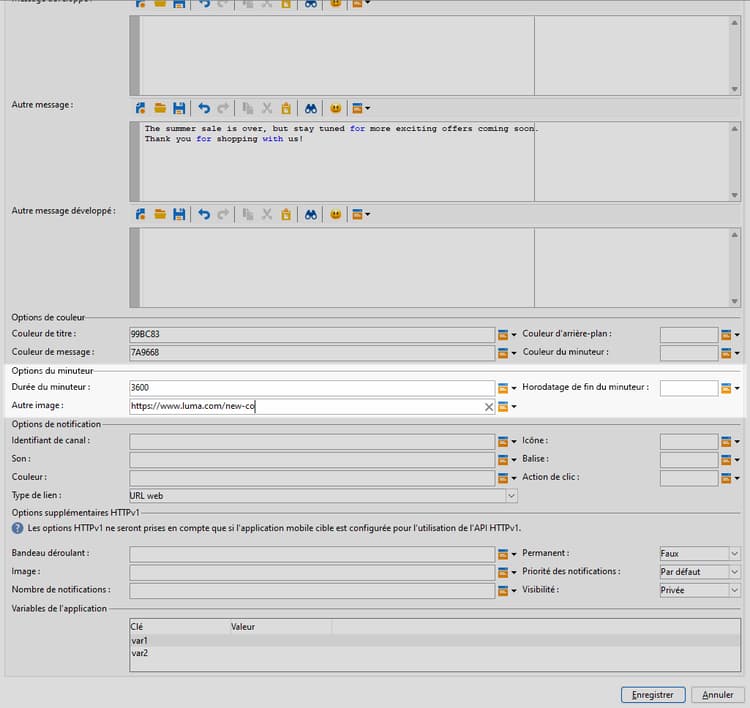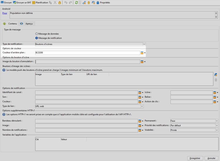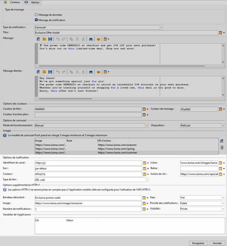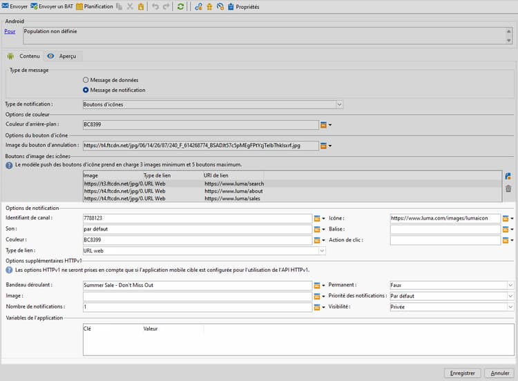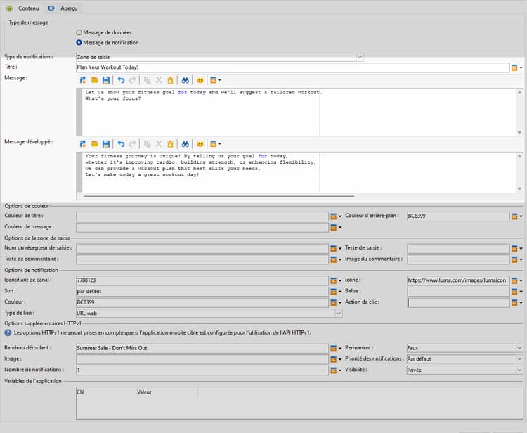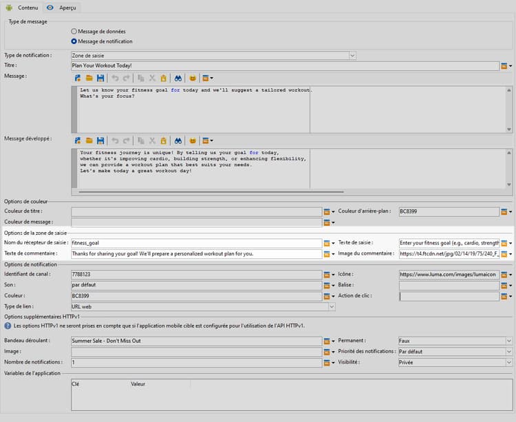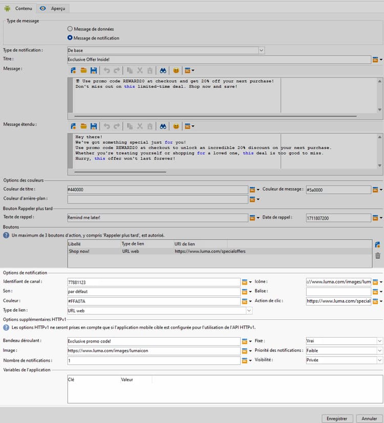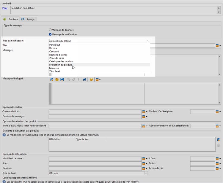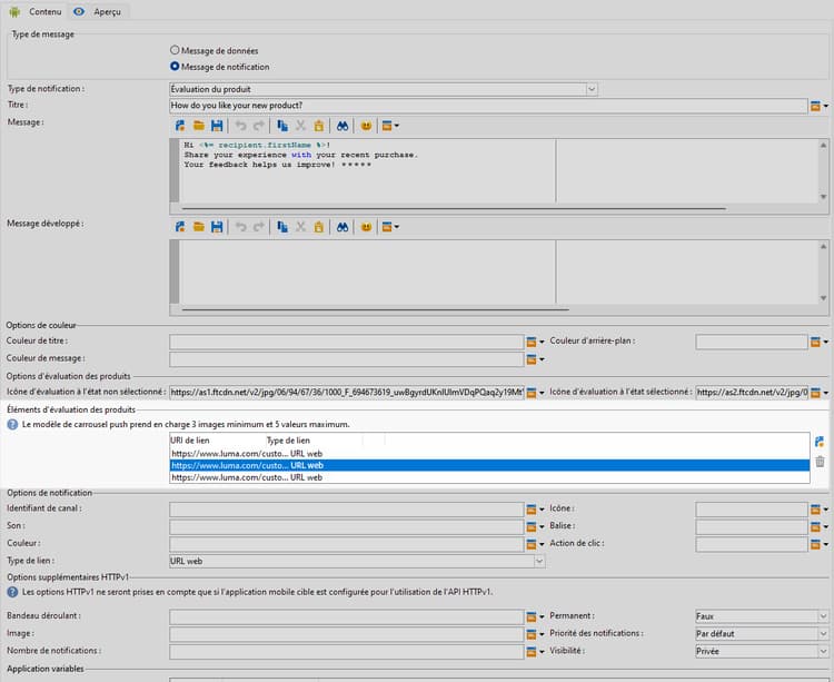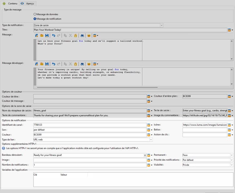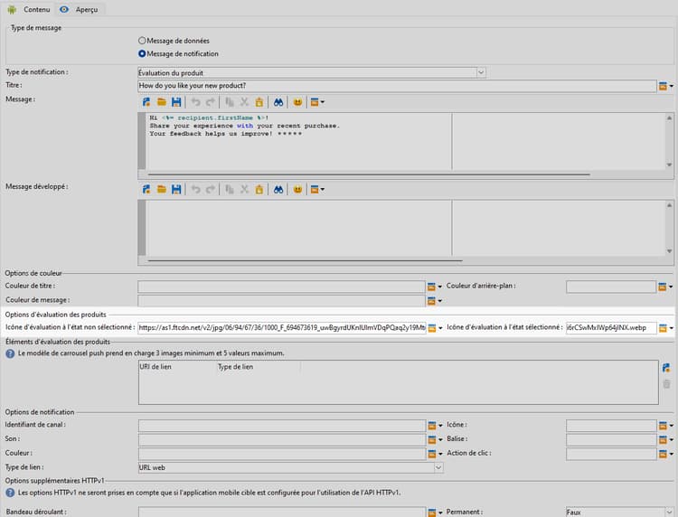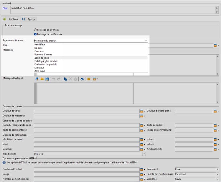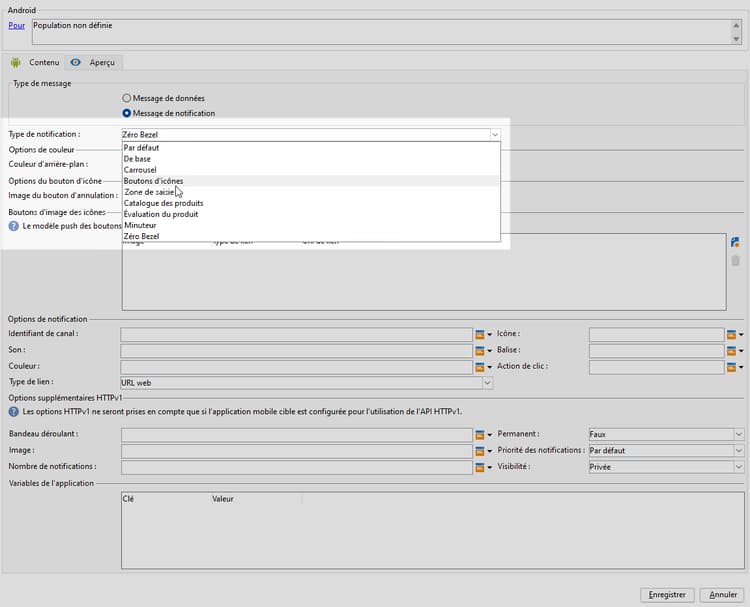 Pour personnaliser davantage votre notification push, configurez les Options de notification et les Options supplémentaires HTTPv1 de votre notification push. En savoir plus