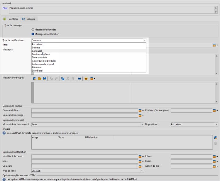 Dans le menu déroulant Type de notification, sélectionnez Carrousel.