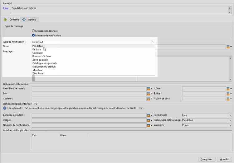 Dans le menu déroulant Type de notification, sélectionnez Par défaut.