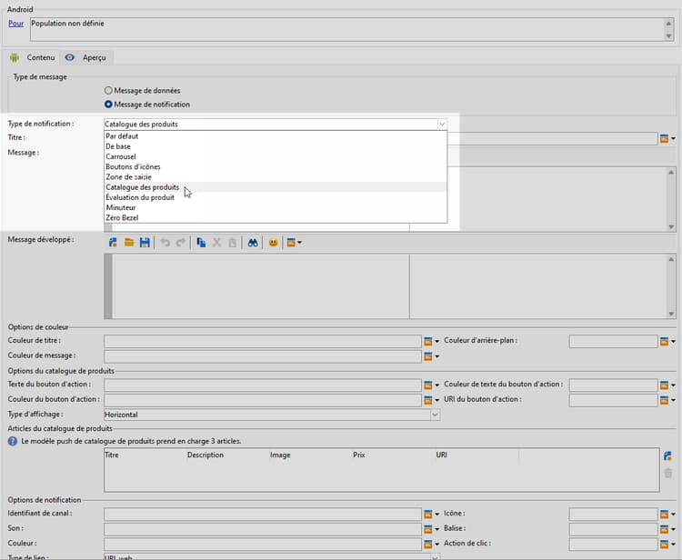 Dans le menu déroulant Type de notification, sélectionnez Catalogue des produits.