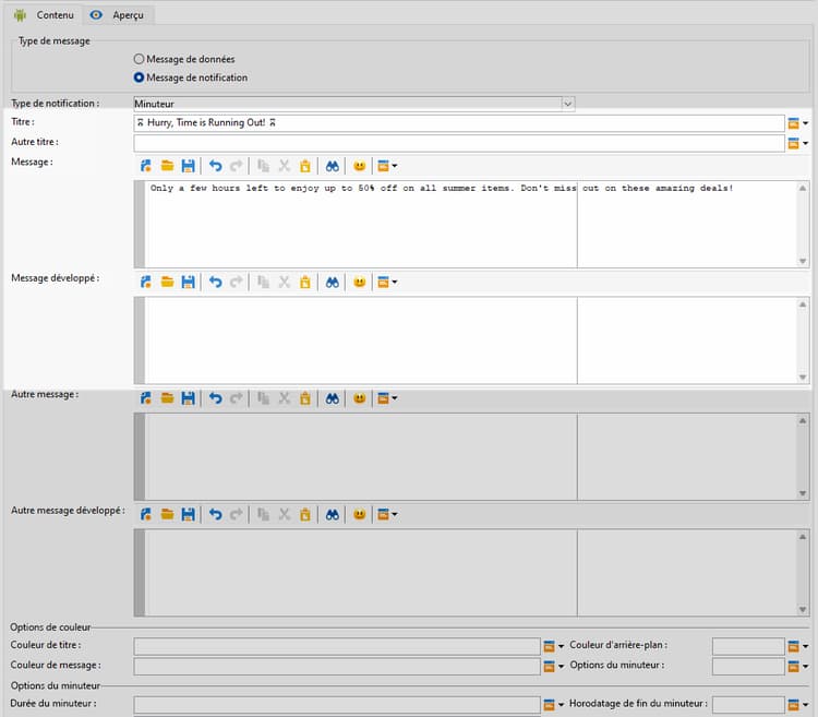 Pour composer votre message, saisissez votre texte dans les champs Titre, Message et Message étendu.