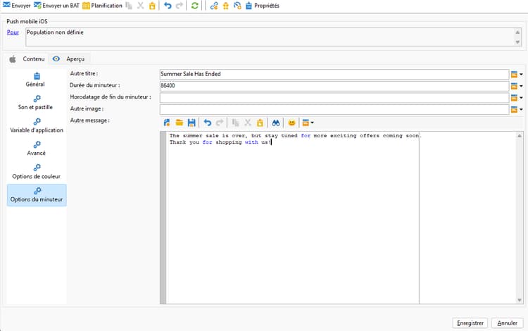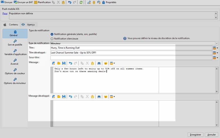 Pour composer votre message, saisissez votre texte dans les champs Titre, Message étendu, Message et Message étendu.
