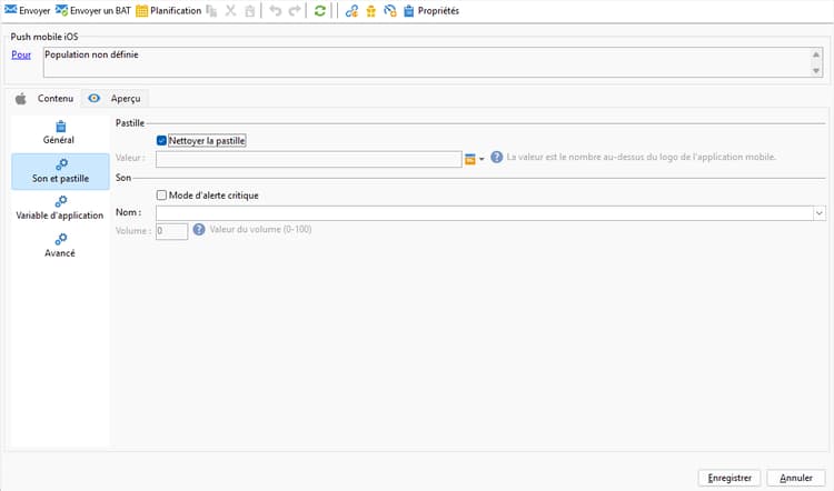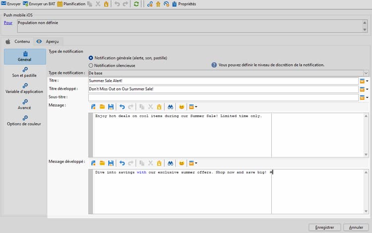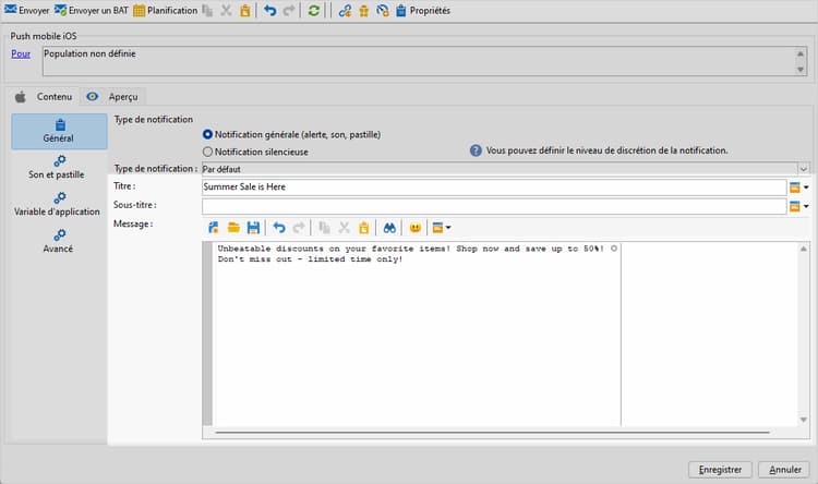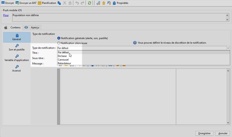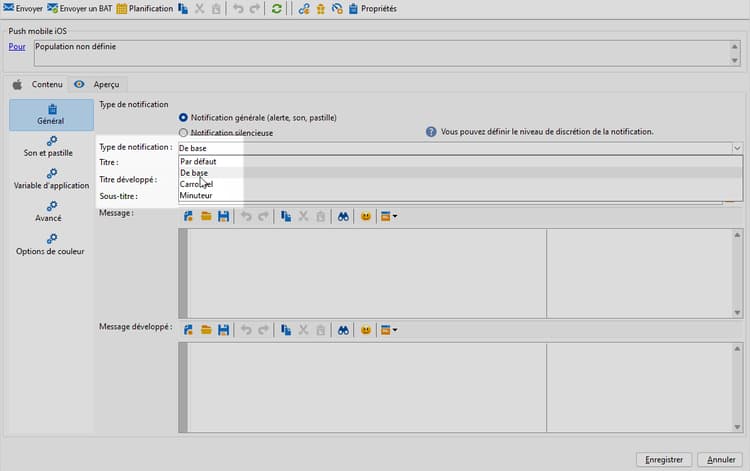 Sélectionnez Notification générale (alerte, son, pastille) comme Type de notification.