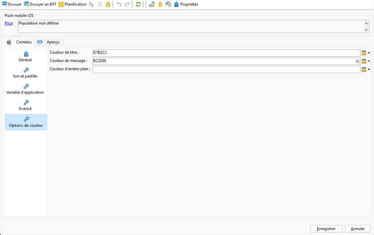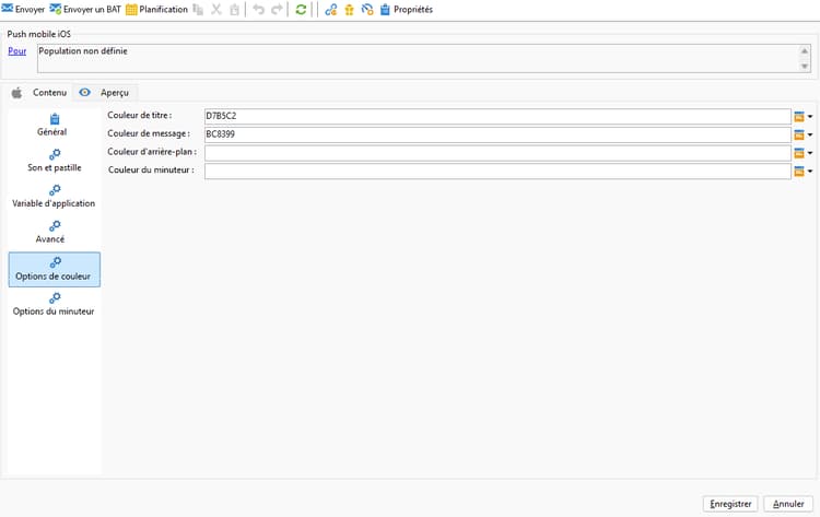 Dans le menu Options des couleurs, saisissez les codes hexadécimaux des couleurs de votre Titre, Message et Arrière-plan.