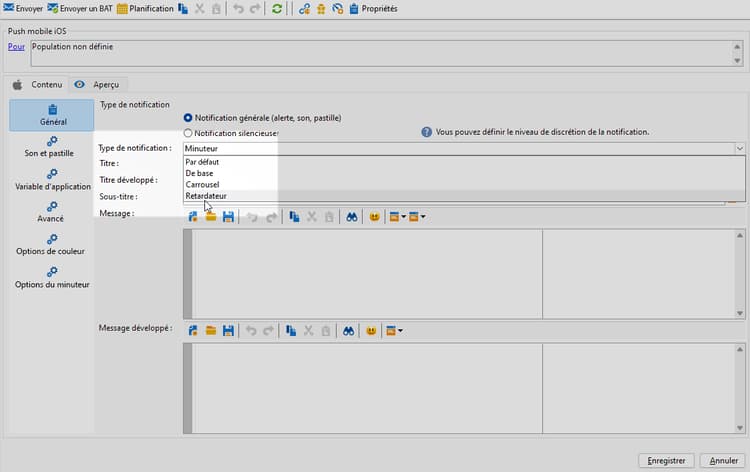 Dans le menu déroulant Type de notification, sélectionnez Retardateur.