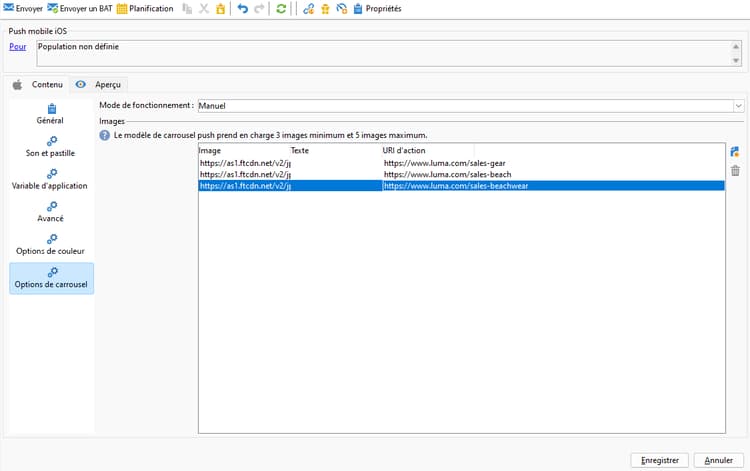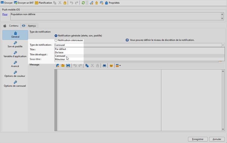 Dans le menu déroulant Type de notification, sélectionnez Carrousel.