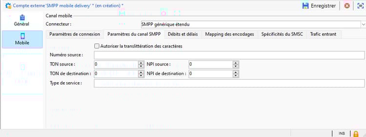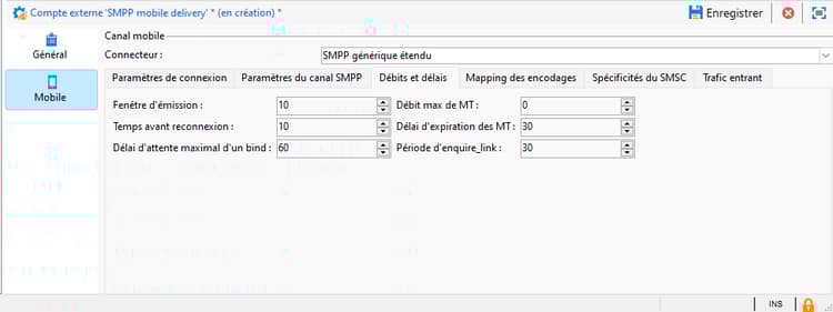 Ces paramètres contrôlent tous les aspects du timing du canal SMPP. Certains fournisseurs ont besoin d’un contrôle très précis du taux de message, des délais de fenêtre et de reprise. Ces paramètres doivent donc être définis sur des valeurs correspondant à la capacité du fournisseur et aux conditions indiquées dans son contrat.