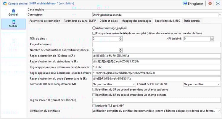 Pour chaque champ, vous pouvez définir la balise associée ainsi que son format. Demandez au fournisseur de services SMPP de disposer de ces informations.