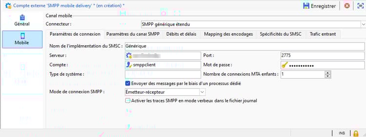 Mot de passe : mot de passe de la connexion SMPP. Transmis dans le champ du mot de passe du PDU BIND.