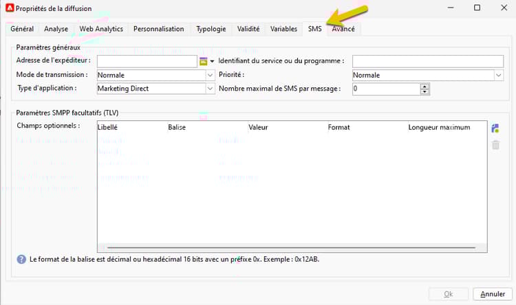Les paramètres techniques nécessaires à une diffusion SMS sont les suivants :