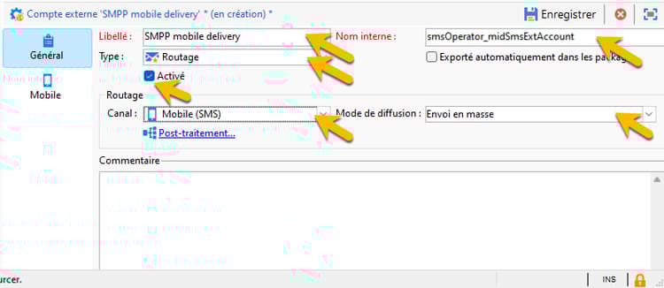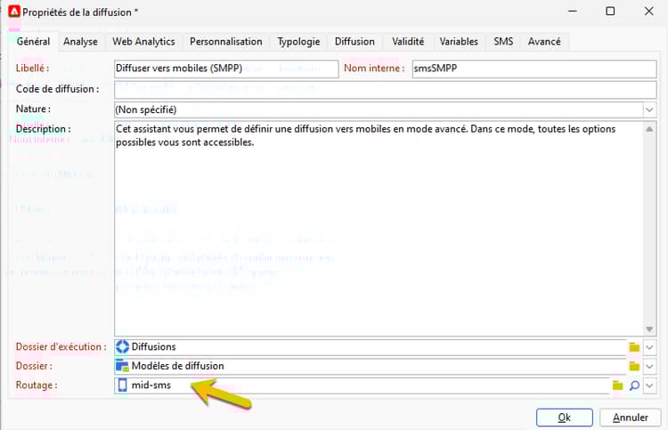 Dans l’onglet Général, dans Routage, sélectionnez votre compte externe SMPP.