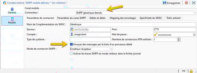 Dans l’onglet Mobile, sélectionnez SMPP générique étendu dans la liste déroulante Connecteur.