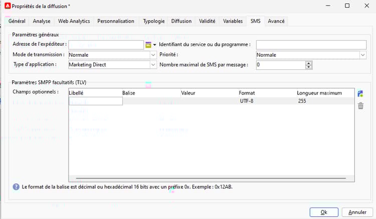 Dans l’onglet SMS, vous pouvez ajouter des paramètres facultatifs à votre modèle.