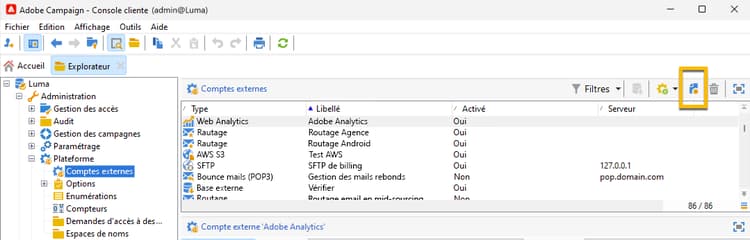 Dans Administration > Plateforme > Comptes externes, cliquez sur l’icône Nouveau.