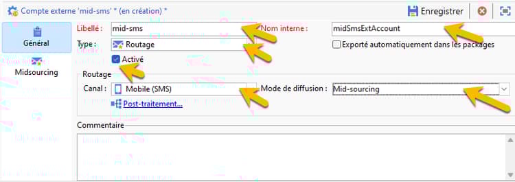 Définissez le Libellé et le Nom interne du compte externe. Définissez le type de compte sur Routage, cochez la case Activé, sélectionnez Mobile (SMS) pour le canal et Midsourcing pour le mode de diffusion.