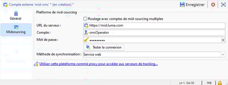 Dans une infrastructure de midsourcing, vous devez créer un compte externe SMS sur le serveur Marketing, comme ci-dessous.