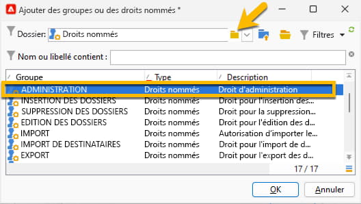 Dans la nouvelle fenêtre ouverte, sélectionnez Droits nommés dans la liste Dossier et sélectionnez ADMINISTRATION dans la liste de droite. -
